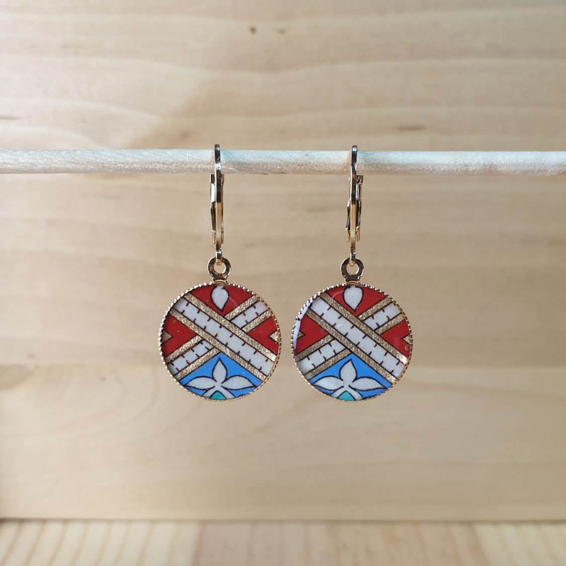 Ces élégantes boucles d'oreille comprennent chacune une enluminure découpée, fixée sur une base en laiton plaqué or et protégée par une couche de résine qui met en valeur la profondeur et l'éclat des couleurs.
