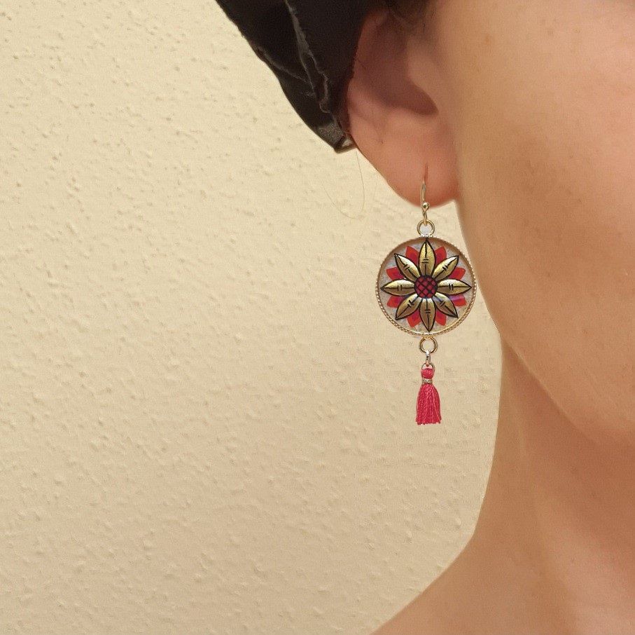 Ces élégantes boucles d'oreille ornées d'une fleur bleue ou rouge aux pétales d'or sont agrémentées d'un mini pompon de couleur assortie.
