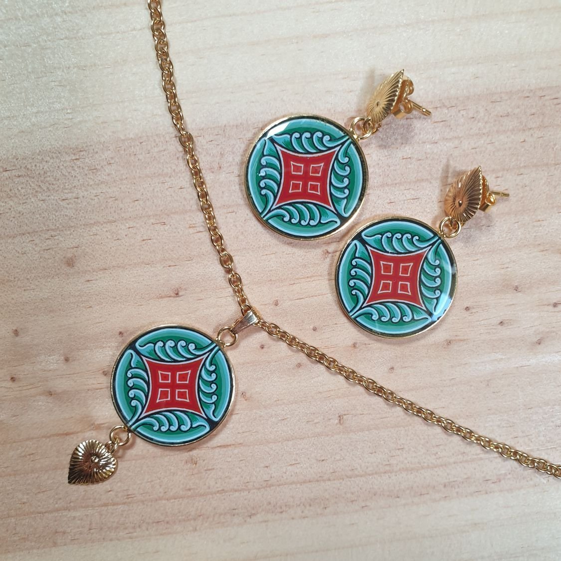 Le support enluminé est suspendu à un clou d'oreille en forme de petite feuille dorée.