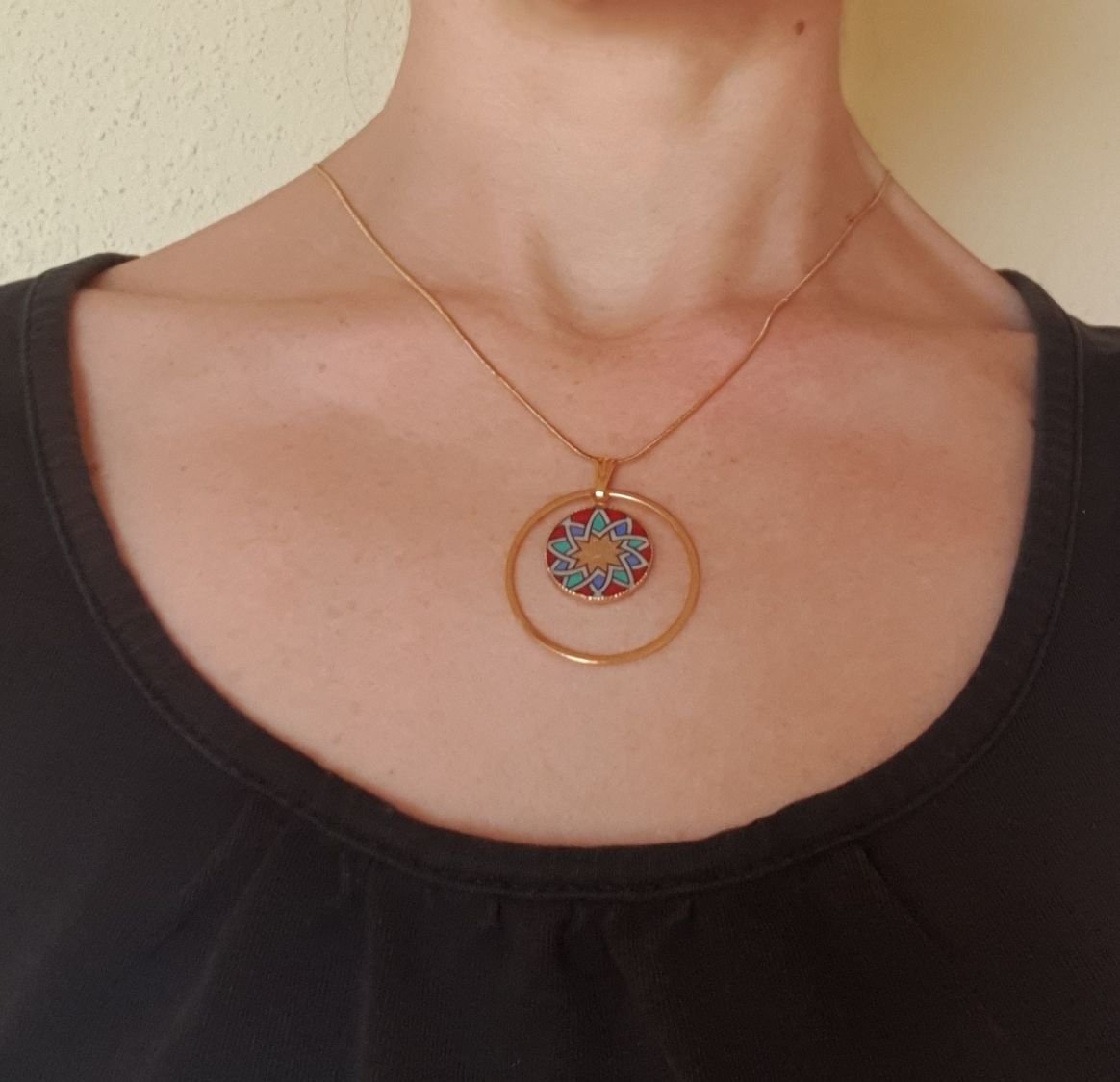 Un pendentif orné d'une rosace colorée et souligné d'un anneau doré est suspendu à une fine chaîne maille serpentine.