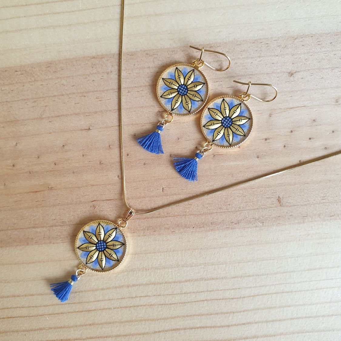 Guld/blått blomsterhalsband med hänge på guldkedja