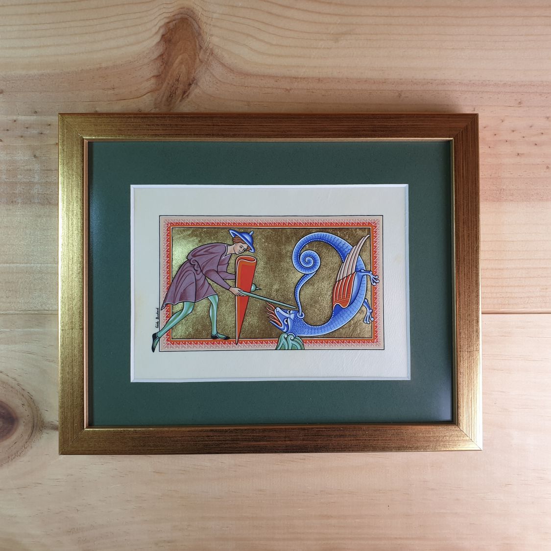 Cette enluminure a été réalisée sur parchemin de chevreau marouflé sur carton bois, en utilisant de la peinture maison à base de pigments purs broyés dans un liant traditionnel, et la feuille d'or est posée sur mixtion.