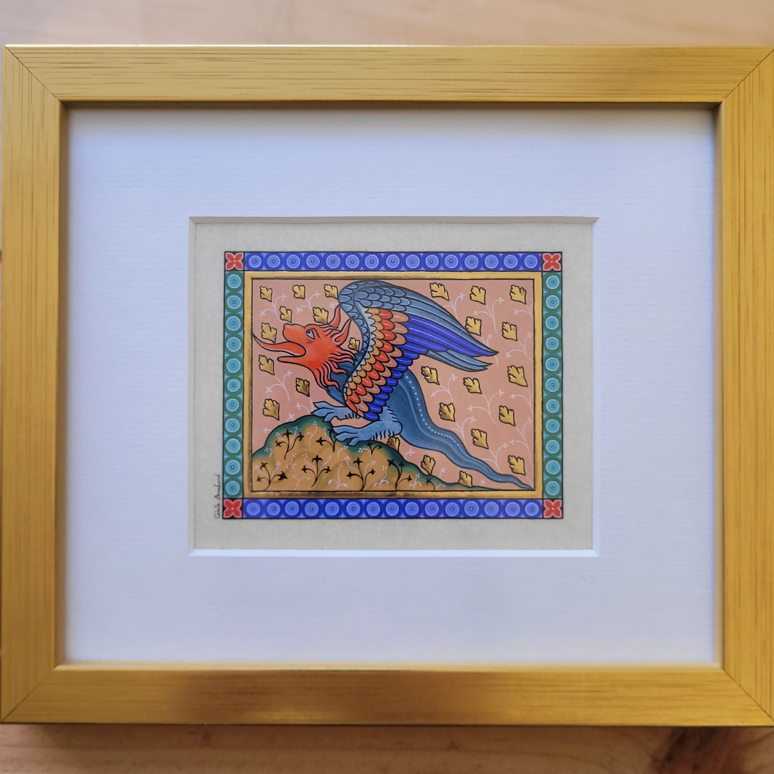 Ce petit dragon enluminé est mis en valeur dans un cadre en bois doré avec passe-partout blanc cassé et verre organique anti-reflet, à poser ou accrocher.