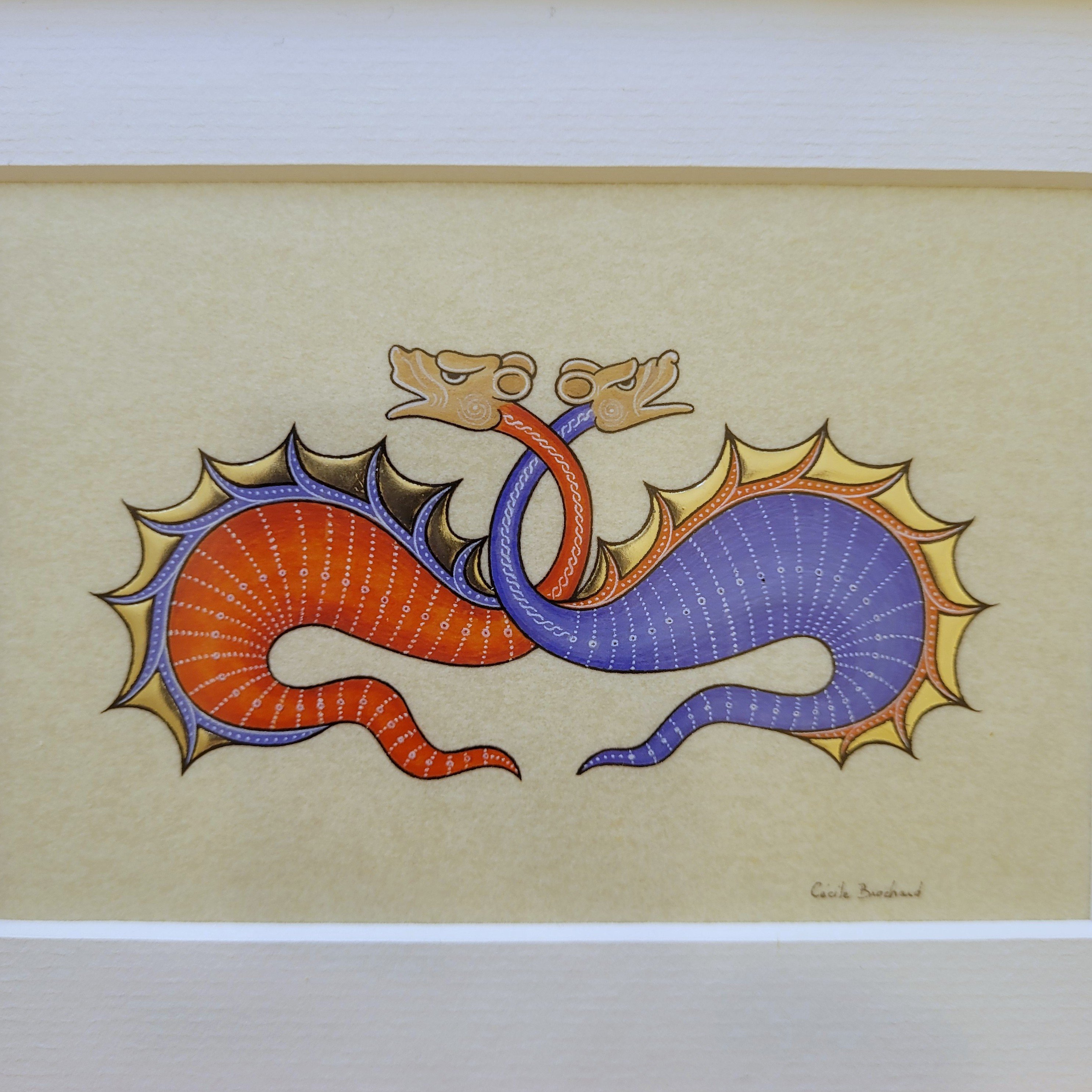 Les crêtes étincelantes des créatures ont été réalisées en appliquant plusieurs couches de gesso (assiette médiévale) qui apportent du relief, puis de l'or blanc en feuille, poli ensuite à l'agate.